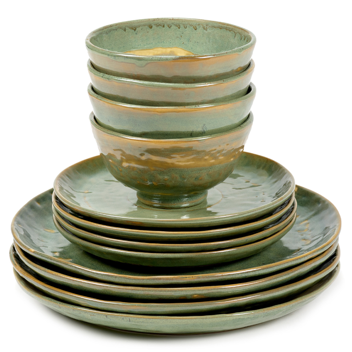 Dankzij de combinatie van borden en kommen is deze diner set breed inzetbaar, van ontbijt en lunch tot diner. Een sterke keuze voor klanten die op zoek zijn naar een groene serviesset, een design serviesset of een vooraf samengestelde servies set in steengoed met meer karakter.